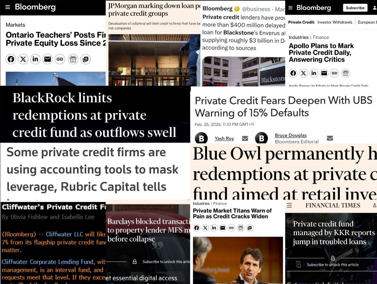 Somewhere in the last two weeks, something quietly cracked in the American private credit market. BlackRock, Blue Owl, JPMorgan — several large funds managing something in the neighbourhood of $300 billion combined — have suspended redemptions. The gates are down. Investors who thought they owned liquid-ish exposure to the infrastructure of the AI age have discovered they own something far less tractable: claims on assets that were never worth what the models said, extended to borrowers who could not survive a real cost-of-capital regime.
