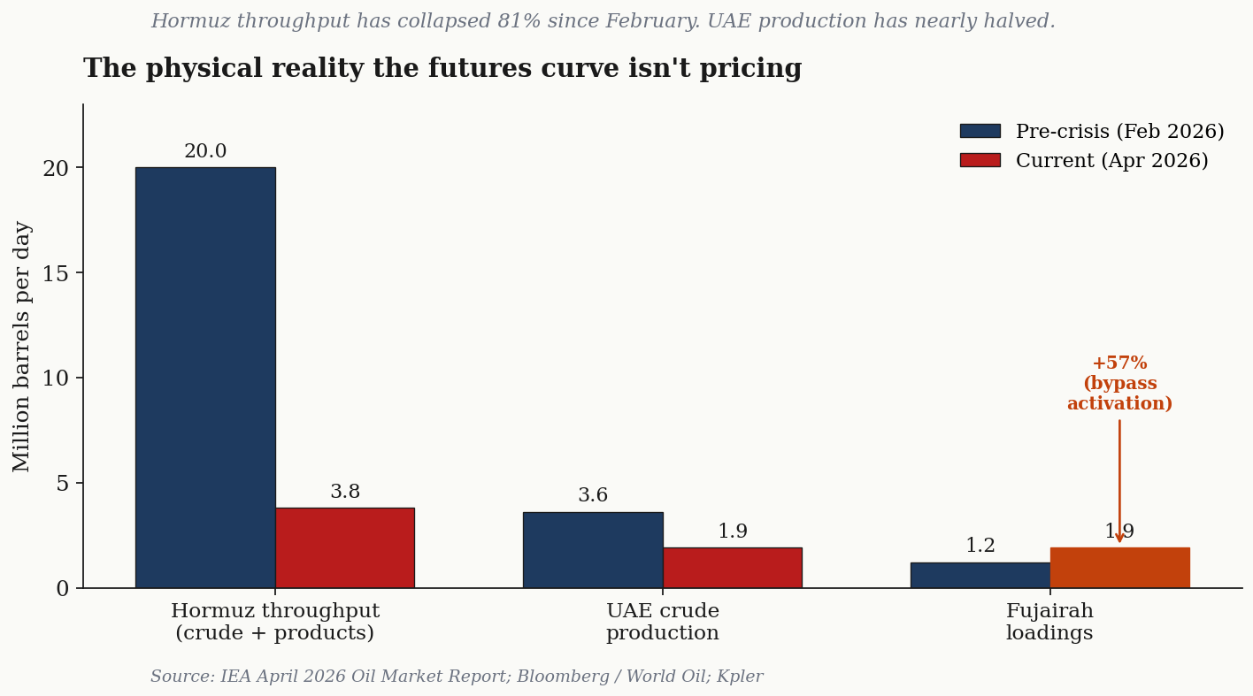 Treasury Secretary Bessent stood in front of Congress and admitted, with the kind of carefully bureaucratic language that always means the opposite of what it says, that the Federal Reserve was negotiating dollar swap lines not just with the United Arab Emirates but with “many of our Gulf allies” and “numerous other countries, including some of our Asian allies.” Three days later, on April 28, the UAE state news agency WAM confirmed what had been rumoured all spring: Abu Dhabi is leaving OPEC and OPEC+ effective May 1, ending a membership that began in 1967, four years before the federation itself was formally established. And underneath both announcements, the physical oil market was doing something that the front of the Brent curve has only haltingly acknowledged: dated North Sea Brent has been trading around $130 a barrel, roughly $60 above pre-conflict levels, while the Strait of Hormuz, which used to move twenty million barrels a day of crude and products, has collapsed to under four million. The IEA’s April 2026 Oil Market Report, in language that is unusual for that institution, calls it the largest disruption in history. Tanker traffic through the strait is effectively zero. Nearly two thousand vessels are stranded in the Persian Gulf. VLCC charter rates have run up six times their pre-crisis level. P&I clubs have suspended war risk cover for vessels entering the strait, which is the insurance industry’s polite way of saying that no rational owner sends a ship in there anymore. War risk premiums, when they can be obtained at all, have moved from a quarter-point of vessel value per transit to commercially prohibitive territory. This is not a slowdown. This is a chokehold.